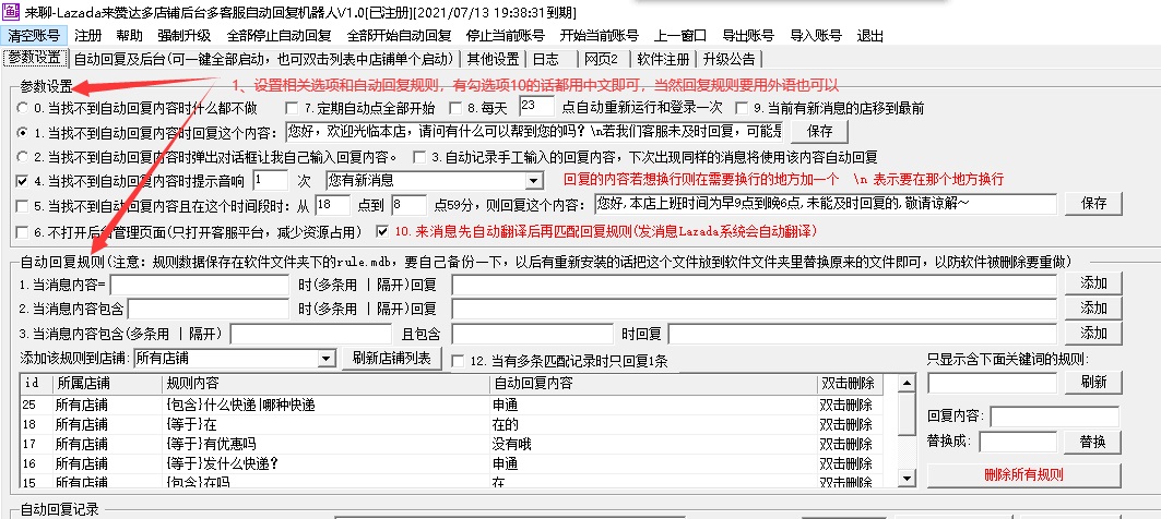 软件支持Lazada跨境店和本土店,可以自动翻译客户发过来的消息再匹配回复规则,自动发出的消息lazada平台自己已经可以自动翻译,无需软件翻译。