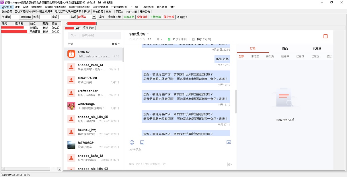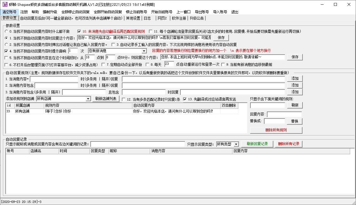软件支持同时添加所有虾皮8个站点的店铺,可以自动翻译客户发过来的消息再匹配回复规则,自动发出的消息也可以自动翻译。