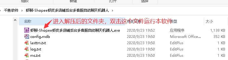 3. 双击解压后的目录“虾聊-Shopee虾皮多店铺后台多客服自动聊天机器人“进入,并双击“虾聊-Shopee虾皮多店铺后台多客服自动聊天机器人”运行本软件