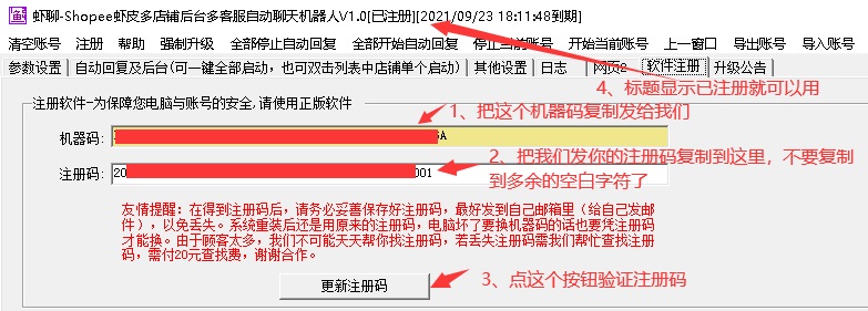 4. 运行后,点“软件注册”,把机器码复制并发送给我们,我们会把注册码发给你,只要把注册码复制到软件里,点“更新注册码”,即可完成注册