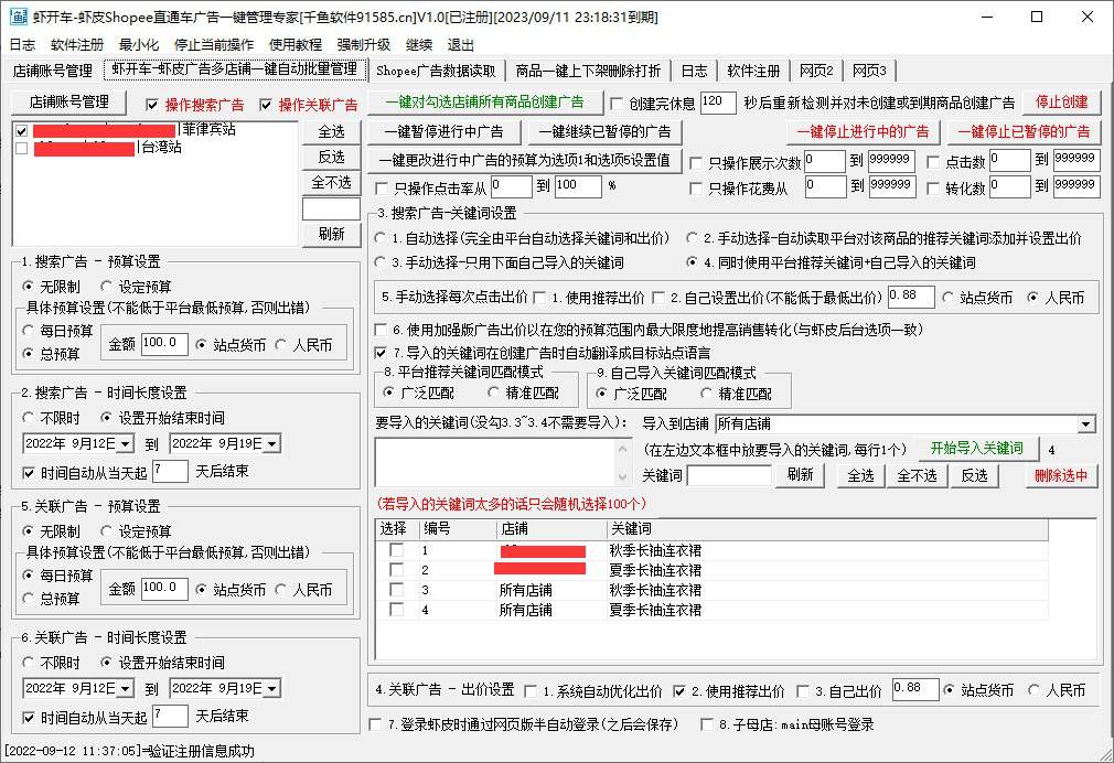 可对多店铺按设置的预算、时间、关键词和出价一键自动批量创建/停止、暂停/继续虾皮Shopee直通车广告(搜索广告和关联广告)改预算和读取相关统计数据,支持虾皮所有14个站点的店铺。