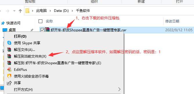 2. 解压缩:右键点击“虾开车-虾皮Shopee直通车广告一键管理专家.rar“,左键点击”释放/解压到这里“,如果需要密码的话,密码是:1
